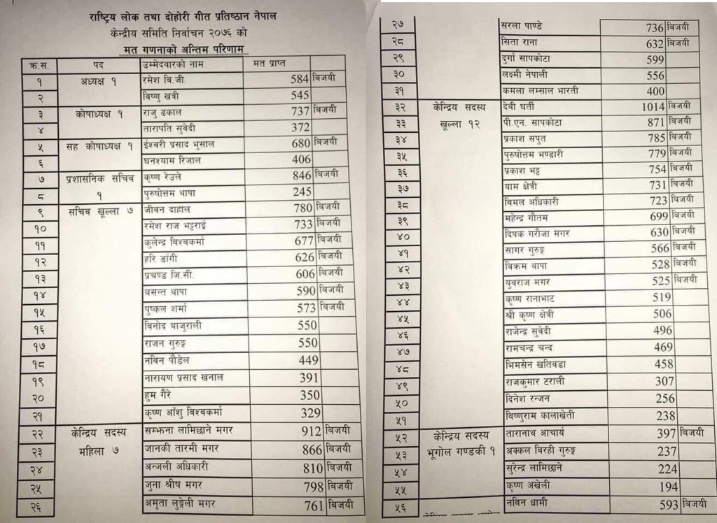 दोहोरी गीत प्रतिष्ठानको अध्यक्षमा रमेश विजी विजयी, ( मत परिणामको सूचि सहित)